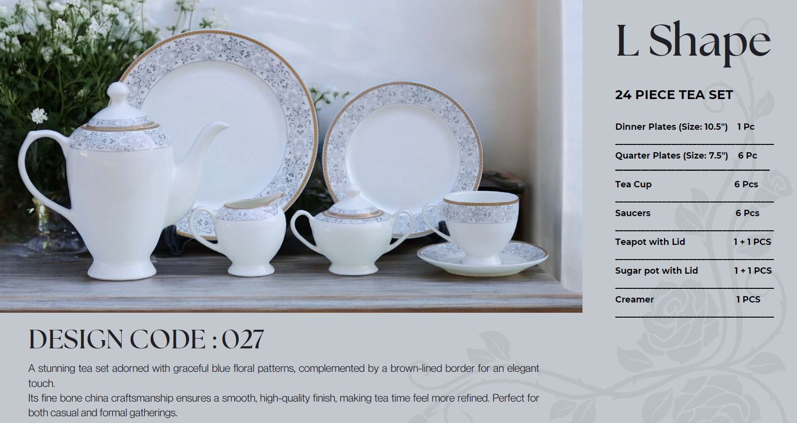 Designed for those who appreciate high-quality crockery, the L027 Tea Set features elegant curves, a rich gold finish, and durable craftsmanship—making it both stylish and long-lasting.