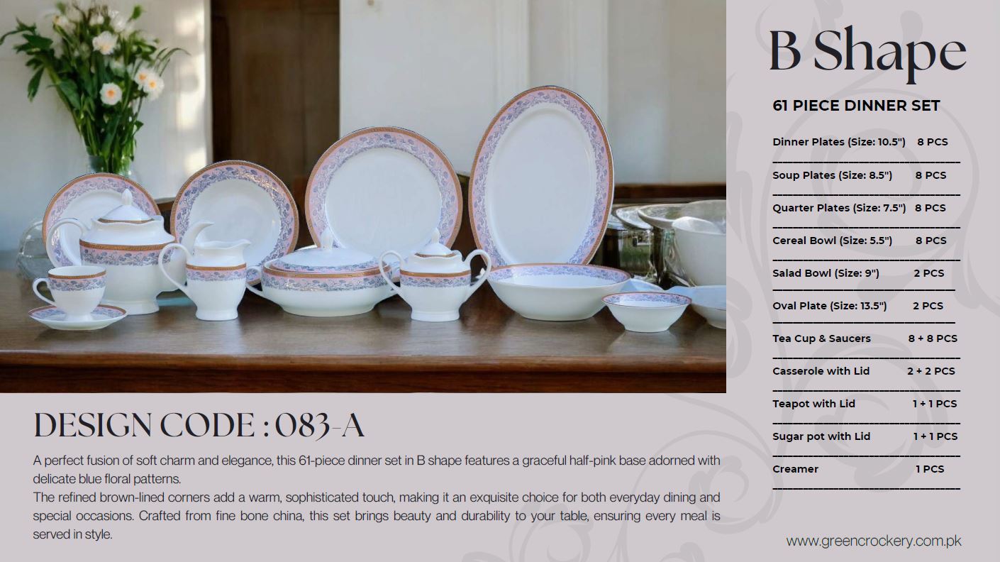 This premium dinnerware set includes everything you need to serve meals beautifully, whether you’re hosting guests, celebrating special occasions, or enjoying family dinners at home. The B083A design blends style with sophistication, making it an ideal choice for homes, restaurants, and gifting.