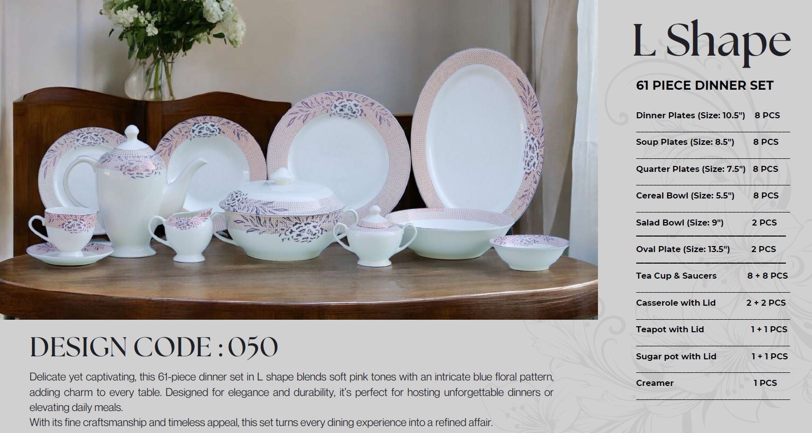 This premium dinnerware set includes everything you need to serve meals beautifully, whether you’re hosting guests, celebrating special occasions, or enjoying family dinners at home. The L050 design blends style with sophistication, making it an ideal choice for homes, restaurants, and gifting.