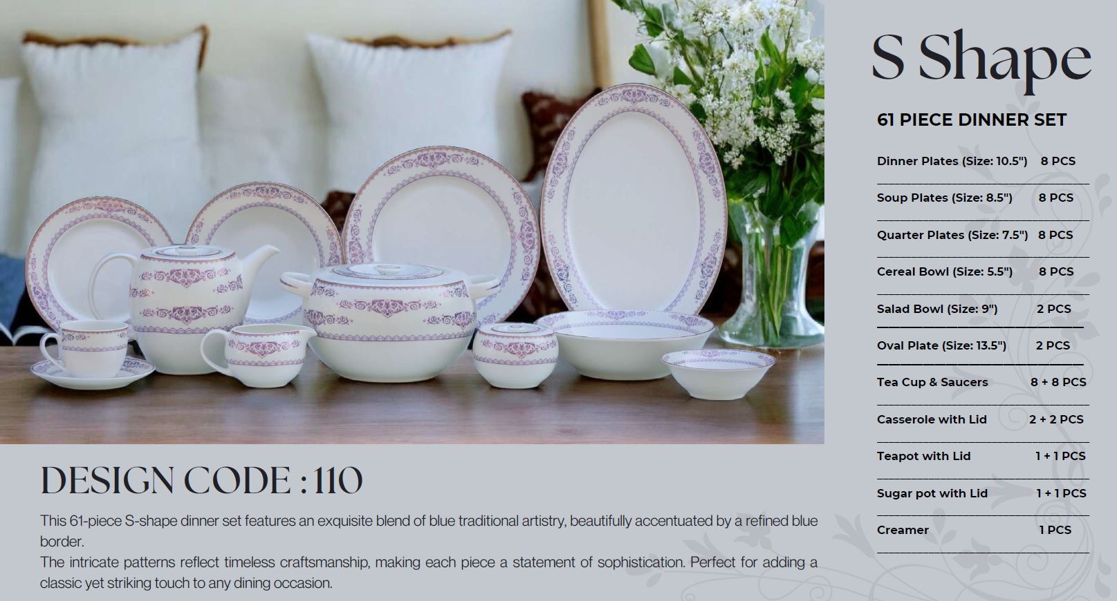 This premium dinnerware set includes everything you need to serve meals beautifully, whether you’re hosting guests, celebrating special occasions, or enjoying family dinners at home. The S110 design blends style with sophistication, making it an ideal choice for homes, restaurants, and gifting.