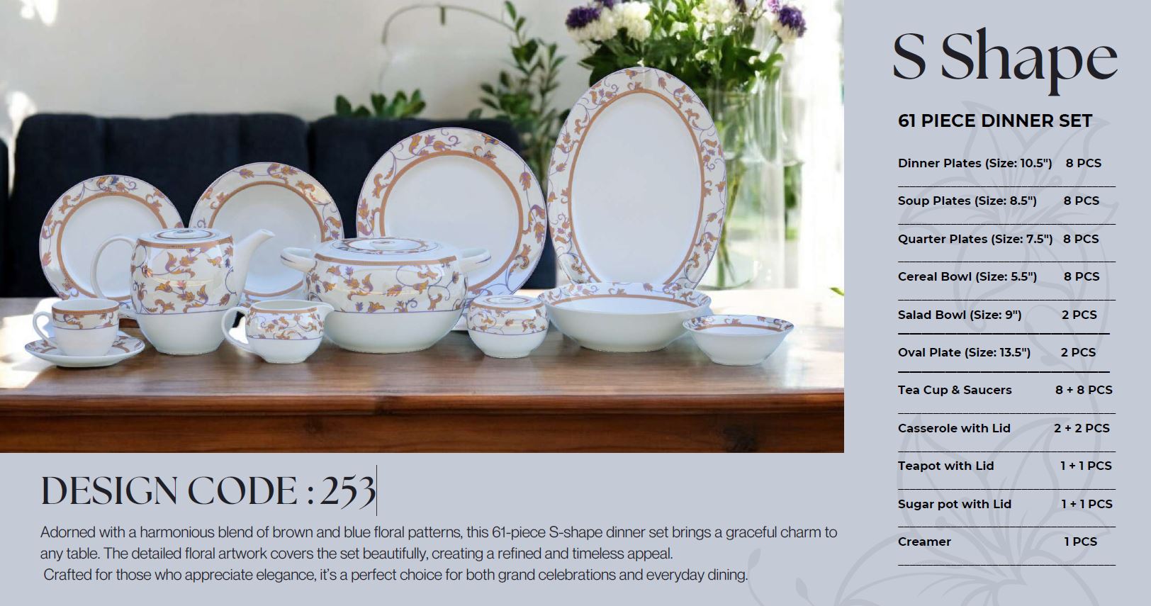 This premium dinnerware set includes everything you need to serve meals beautifully, whether you’re hosting guests, celebrating special occasions, or enjoying family dinners at home. The S253 design blends style with sophistication, making it an ideal choice for homes, restaurants, and gifting.