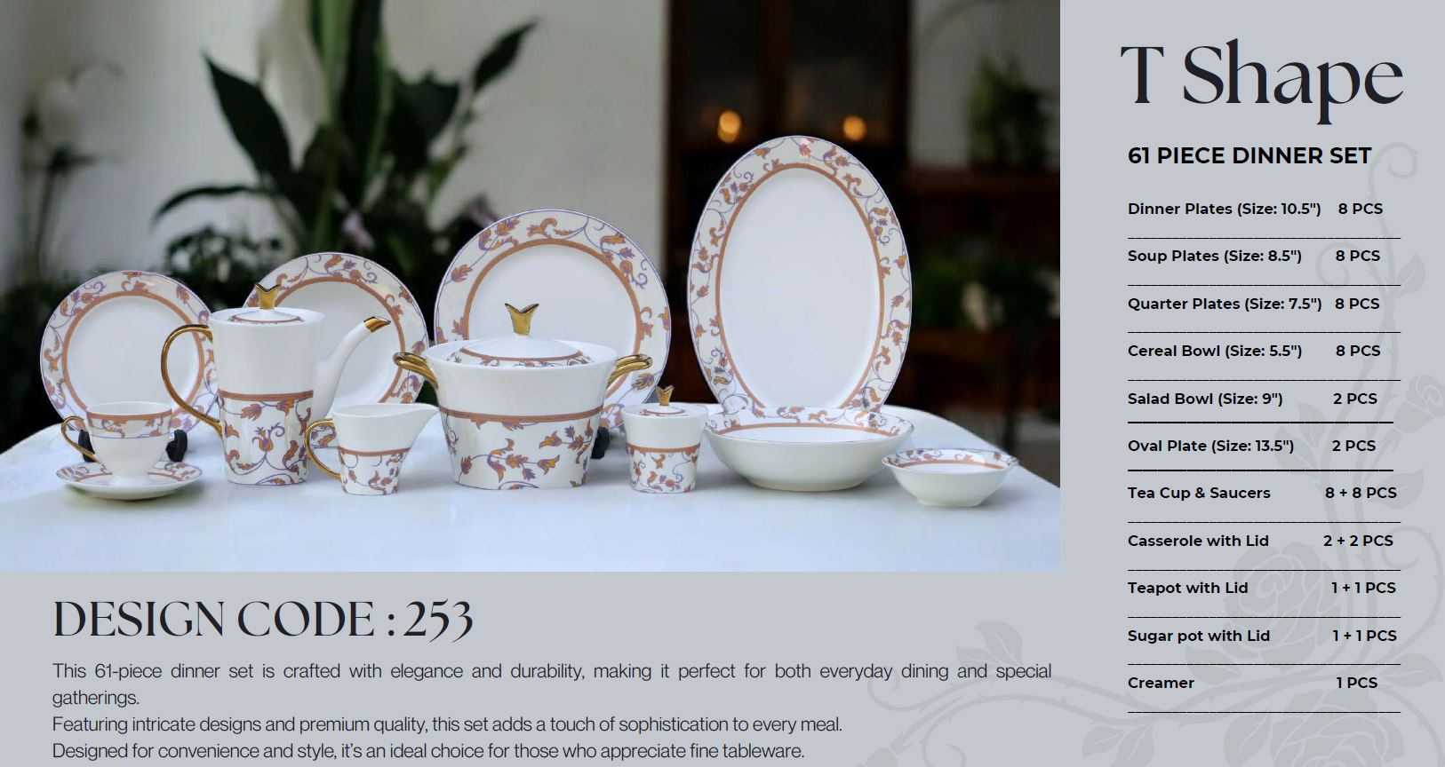 This premium dinnerware set includes everything you need to serve meals beautifully, whether you’re hosting guests, celebrating special occasions, or enjoying family dinners at home. The T253 design blends style with sophistication, making it an ideal choice for homes, restaurants, and gifting.