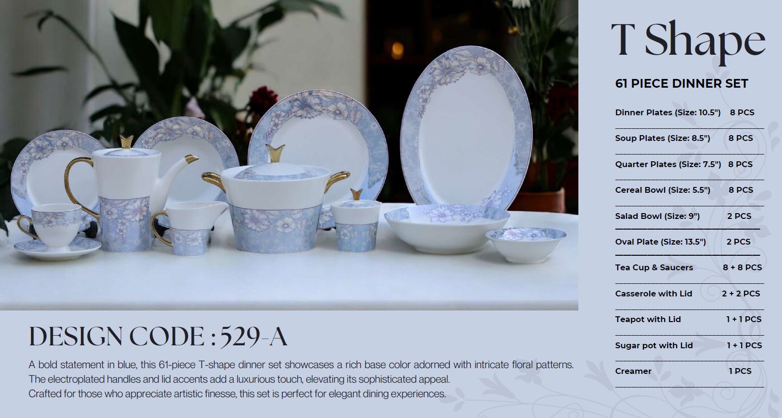 This premium dinnerware set includes everything you need to serve meals beautifully, whether you’re hosting guests, celebrating special occasions, or enjoying family dinners at home. The T229A design blends style with sophistication, making it an ideal choice for homes, restaurants, and gifting.