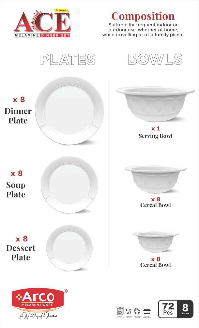 Upgrade your dining experience with the Melamine Dinner Set ACE Dinner Set (7), crafted with premium-quality melamine to give you the perfect combination of style, durability, and convenience. This elegant dinner set is designed to be unbreakable, lightweight, and heat-resistant, making it ideal for both everyday use and special gatherings.
