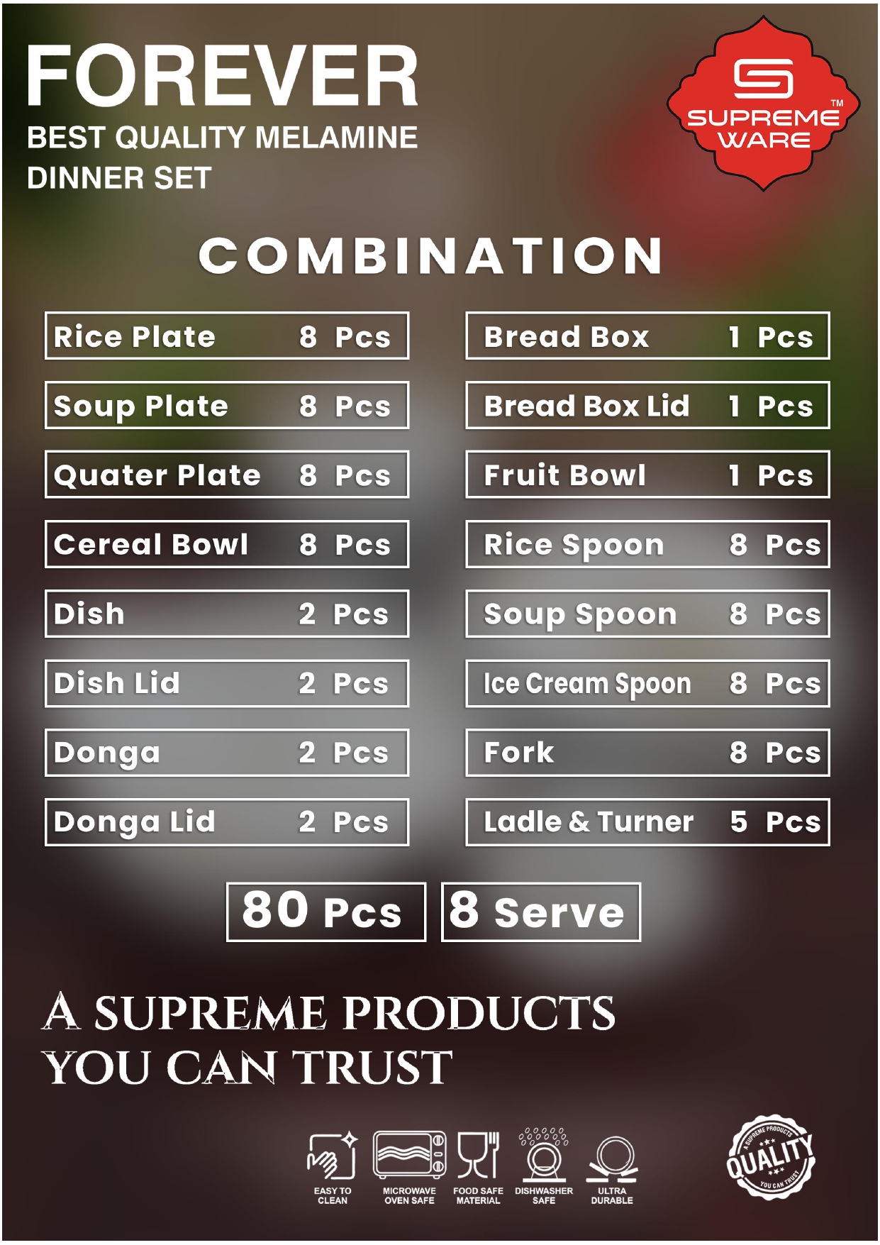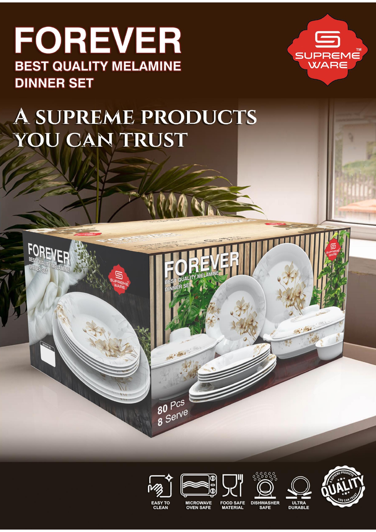 Upgrade your dining experience with the Melamine Dinner Set Forever (7), crafted with premium-quality melamine to give you the perfect combination of style, durability, and convenience. This elegant dinner set is designed to be unbreakable, lightweight, and heat-resistant, making it ideal for both everyday use and special gatherings.